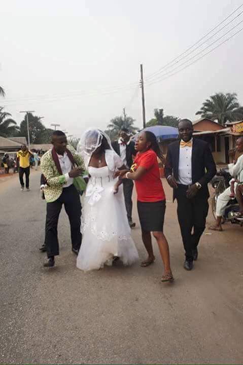A viral picture making the rounds on social media shows a bride running out of a church in her wedding gown with people chasing after her. The bride was said to have discovered that her groom is not who he says he is.It is alleged that the groom says he works with